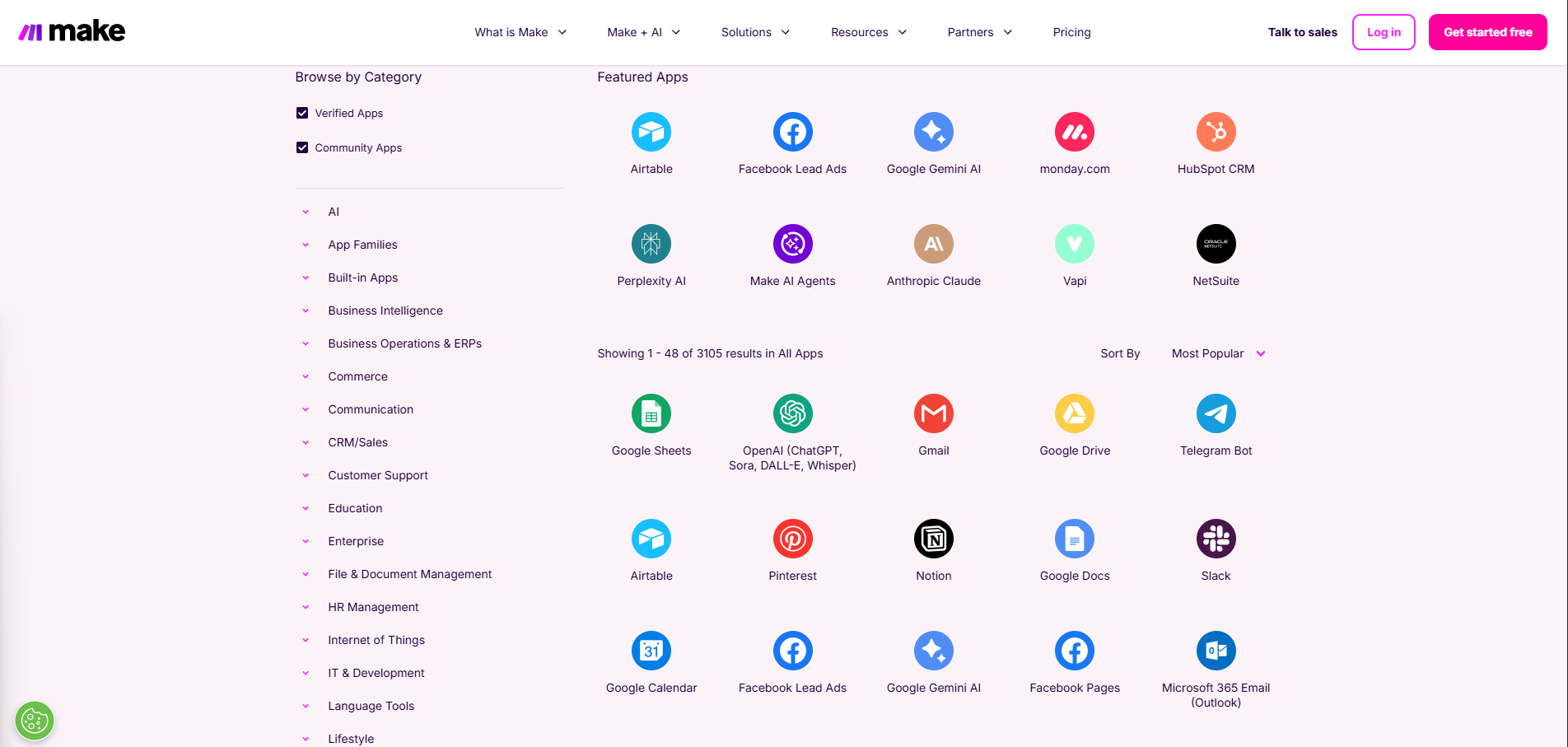 Make supports 3,000+ apps across business, productivity, and developer categories. Users can connect popular tools like Slack, Google Sheets, Notion, and Shopify, or link custom services through APIs. The platform also includes prebuilt templates that simplify setup for common business automations.