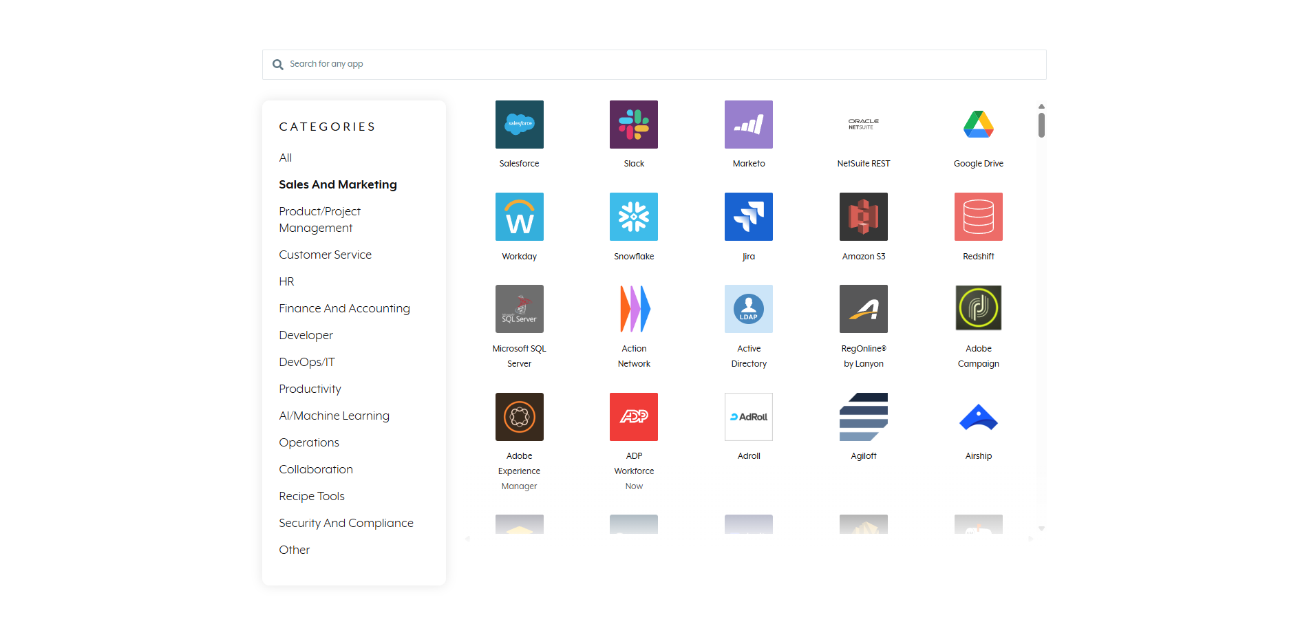 Workato includes over 1,200 pre-built connectors covering most major business apps. The catalog is smaller than Zapier’s or Make’s but emphasizes reliability and governance features suited to enterprise use.