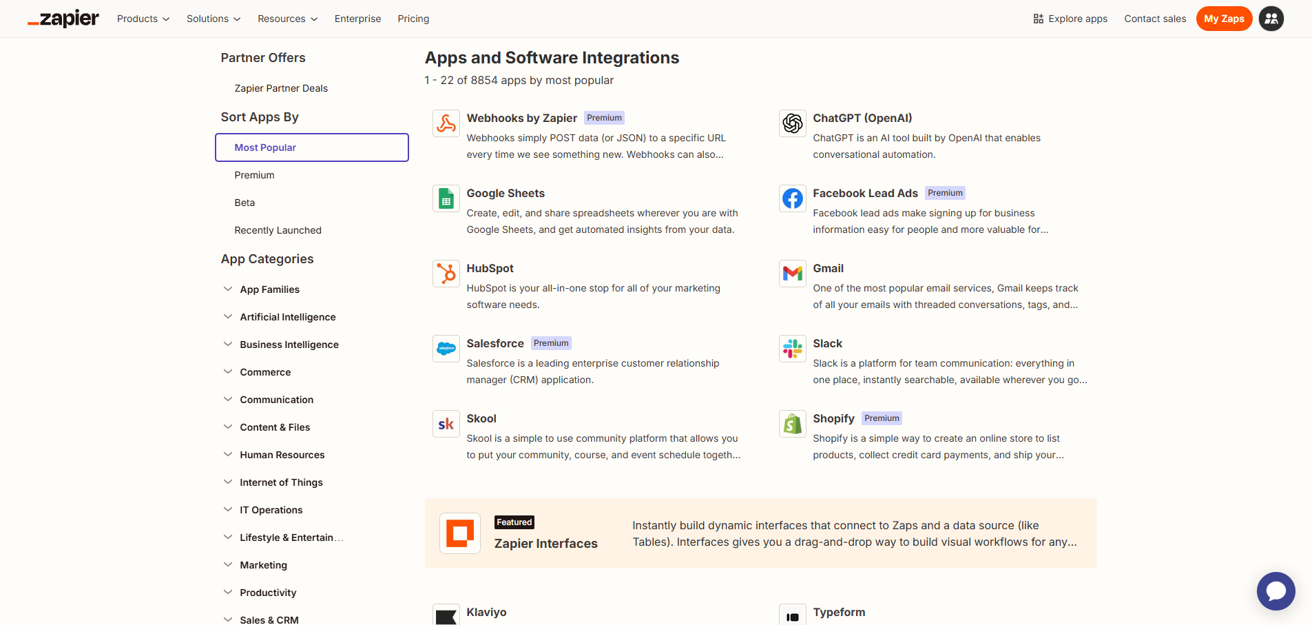 Zapier connects with 8,000+ apps, making it one of the largest integration ecosystems among automation platforms. It spans every major category, including CRM, marketing, project management, finance, and AI tools. Each integration includes defined triggers and actions that let users send and receive data between apps with minimal setup.